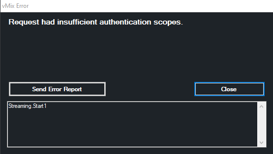 This error will occur if you miss an important step during the login process. To fix, login to YouTube again via vMix. But when you reach the below step make sure you tick the last checkbox for "Manage your YouTube Account". This is required in order for vMix to have the appropriate permissions. Once this box is ticked, the error will be resolved.